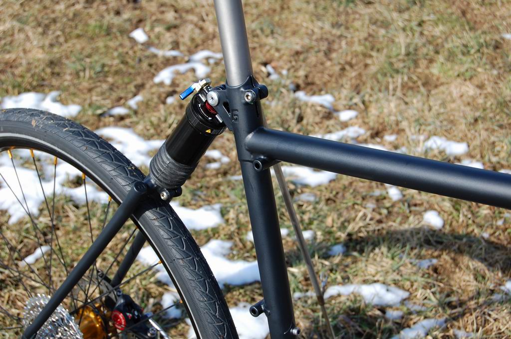 Mir macht es ja immer Spaß, spezielle Lösungen für besondere Ansprüche zu finden. Wobei dieses Rad für meine Verhältnisse schon gar nicht mehr so speziell ist, habe ich doch im letzten Jahr schon ein sehr ähnliches Rad gebaut. Allerdings gibt es auch deutliche Unterschiede: Bei diesem Rahmen wurde mehr Wert auf geringes Gewicht gelegt und so wurden zum Beispiel außenliegende Züge verwendet, was wiederum leichtere Rohre erlaubte. Schließlich wird dieses Rad auf dem täglichen Weg zur Arbeit mehrere hundert Höhenmeter zu überwinden haben. Diesem Einsatzzweck entsprechend wurde der Rahmen mehrschichtig pulverbeschichtet und es wurden sogar Befestigungsmöglichkeiten für einen freitragenden Gepäckträger vorgesehen. Auch dem Einsatzzweck zugute kommen die wartungsarmen Federungen vorne wie hinten. Faltenbälge schützen Federbein wie Gabel, bei der es sich wieder um eine Stahlgabel mit Federungstechnik einer Headshok von Cannondale handelt. Gabel wie Federbein sind über den Luftdruck auf das Körpergewicht einstellbar. Das Rad ist mit einer sehr leichten Ausstattung versehen, zum guten Teil wurden die Komponenten direkt vom Kunden ausgesucht. Bei der Schaltung bin ich besonders froh über die Wahl, habe ich das XX-Schaltwerk doch bei SRAM als verantwortlicher Senior Design Engineer betreut. Auch wenn es eigentlich eine reinrassige Renngruppe ist, ist das Schaltwerk mit seiner weitgespreizten 11-36 Zähne10fach-Kassette auch ideal für andere Anwendungen. Wie gesagt wird dieses Rad täglich auf und ab gefahren, da ist man sowohl auf leichte als auch auf schwere Gänge angewiesen. Das Rad wiegt ohne Pedale 9,1 Kg. |