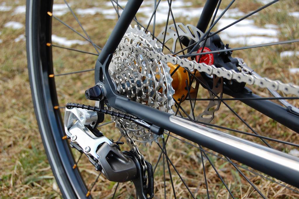 Gut zu sehen ist allerdings die Nabe, und zwar durch die vielen großen Fenster der Kassette. Beim Mountainbike weiß man diese Fenster zu schätzen, weil die Kette jeden Schlamm und Schmutz durch diese Fenster drückt und dadurch aus den Zähnen entfernt. Wer den Geldersheimer Lehmboden kennt, weiß das zu schätzen.:-) |