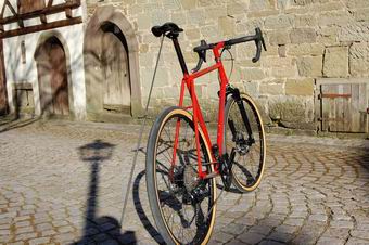 GEBLA FerroadFS In der hochoffiziellen und hochglanzgedruckten Fahrradwelt läuft so ein Rad unter Gravel. Da ich solche Fahrräder schon länger baue als es diesen Begriff dafür überhaupt gibt, habe ich es gerne Tourenrennrad genannt. Denn man muß ja nicht auf Schotter fahren, man kann. Für die meisten Nutzer ist es schlicht das bessere Rennrad, weil es fast genauso leicht auf der Straße rollt, man aber keine Angst vor neuen Wegen haben muß, die sich dann irgendwann in einen Feldweg verwandeln. Aber nun zum Rad selbst. Am auffälligsten ist sicherlich die Federgabel, aber es gibt noch ein paar Details mehr zu entdecken. Dazu mehr unten bei den Bildern. Was man auf den Bildern nicht sieht, ist, daß der gesamte Rahmen bis auf Steuerrohr und Vorbau aus rostfreiem Stahl von Columbus gebaut sind. Die verbaute RockShox Rudy Gabel ist relativ neu und speziell auf Gravel-Räder ausgelegt. Da sie wie viele aktuelle Carbon-Gabeln mit einem sogenannten Tapered-Schaft ausgestattet ist, muß der Rahmen darauf ausgelegt sein. Hier wird das durch das konische Steuerrohr erreicht. Das ist etwas leichter als ein durchgehend dickes und sieht nicht ganz so massiv aus. Geschaltet und gebremst wird mit Shimanos GRX Gruppe, sie hat sich als gut und funktionell bewährt. Laufräder, Innenlager und Steuersatz sind von Hope. Hergestellt in Großbrittanien, wo man damit rechnet, daß Fahrradteile auch einen länger anhaltenden Regen überstehen müssen. Deshalb sind die Kugellager aus rostfreiem Stahl und gut gedichtet. Trotzdem öffne ich Teile wie das Innenlager und den Steuersatz noch einmal vor dem Einbau und versehe die Lager randvoll mit wasserbeständigem Fett. Sicher ist sicher. |