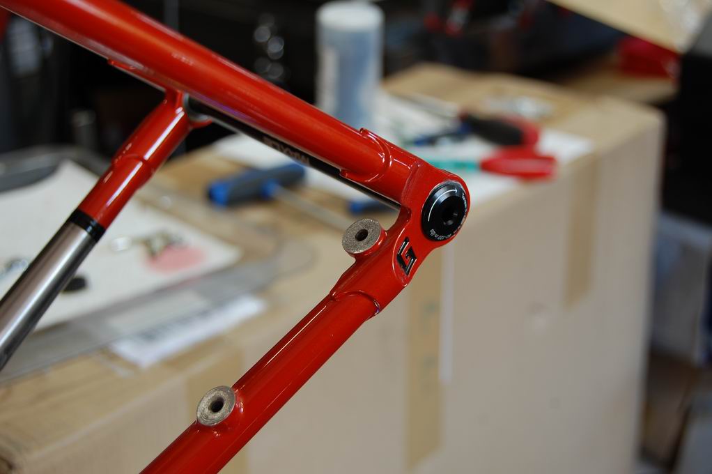Der hintere Bremszug und das Kabel für die Schaltung sind im Unterrohr geführt, der Bremszug in einem separaten Röhrchen aus rostfreiem Stahl, so daß man ihn bei der Montage nur durchschieben muß.