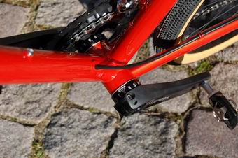 Der ganze Hinterbau ist wie die drei Hauptrohre aus rostfreiem Stahl von Columbus. Die Kettenstreben sind in extra Maßen für mich hergestellt, die rechte Kettenstrebe bleibt unlackiert. Dadurch gibt es keine Macken, sollte die Kette bei gröberen Fahrten mal auf die Kettenstrebe schlagen. Früher hatten viele hochwertige Rahmen deswegen verchromte Kettenstreben oder auch ganze Hinterbauten. Auch das geht mit Hinterbauten aus rostfreiem Stahl.
